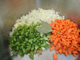 In a big stock pot, mix the beans, stock, carrot, bay leaves, pepper, and onion. Note: If you have a food processor, you could run all the veggies through that. They are pretty much undistinguishable when the soup is done because they cook down completely. Bring it all to a boil, then reduce to a simmer. Simmer for 90 minutes.